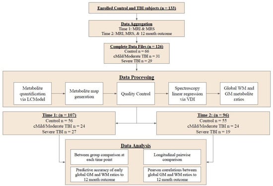 The study data were obtained from a longitudinal, prospective study investigating metabolite changes after pediatric TBI []. This study recruited from hospital admissions and the surrounding community pediatric clinics in the case of healthy controls between 2010–2015. This study initially included data from 133 enrolled children (69 controls, 33 cMild/Moderate TBI, 31 Severe TBI). Seven MRSI studies were excluded due to missing and/or incomplete files; 3 from the control group, 2 from the cMild/mod TBI group, and 2 from the severe TBI group. The remaining population of 126 subjects included 29 subjects with severe TBI, 31 subjects with cMild/moderate TBI, and 66 control subjects who underwent data processing (study design Figure 1). Following spectral quality analysis, acute data from 107 subjects (severe TBI n = 27, cMild/moderate TBI n = 24, and control n = 56) were included in the subsequent time 1 data analysis. At time 2 (12-month follow-up), 96 subjects (severe TBI n = 19, cMild/moderate TBI n = 24, and control n = 55) were included in the time 2 data analysis. Only 77 subjects (severe TBI n = 17, cMild/moderate TBI n = 15, and control n = 45) completed MRSI studies at both time 1 and time 2 and were included in the longitudinal pairwise comparisons.