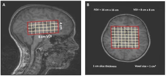 A custom MATLAB (MATLAB 2021b; The MathWorks Inc., Natick, MA, USA) script using Visual Display Interface (VDI, version 1.1.3) was used to generate NAA/Cr, NAA/Cho, and Cho/Cr metabolite ratio maps overlaid on the original T1 MPRAGE image []. Metabolite maps were inspected for anatomical misregistration and subsequently used in the tissue linear regression (below) to generate global WM and GM metabolite ratios. At this point, the entire field of view (FOV) had been reconstructed and incorporated into the metabolite map, requiring further processing to define the proper VOI as outlined above. This was accomplished in MRIcroGL.exe (1.2.2, www.nitrc.org, accessed on 1 April 2023).