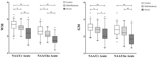 Acute global white matter (WM, left) and gray matter (GM, right) metabolite ratios in control versus complicated mild/moderate and severe TBI subjects. The box represents the 25th percentile, median, and 75th percentile, the whiskers extend from 5% to 95% of data, and the dots represent outliers. WM NAA/Cr and NAA/Cho are significantly reduced in both TBI groups compared to controls. GM NAA/Cr was significantly reduced in both TBI groups compared to controls whereas GM NAA/Cho was significantly reduced in severe TBI compared to controls or cMild/moderate TBI. Significant differences in means as determined by ANCOVA covering for age with post hoc with Bonferroni analysis, * p ≤ 0.02 and ** p ≤ 0.001. ANCOVA, analysis of covariance; cMild, complicated mild; Cr, creatine; Cho, choline, GM, gray matter; NAA, N-acetylaspartate; TBI, traumatic brain injury; WM, white matter.