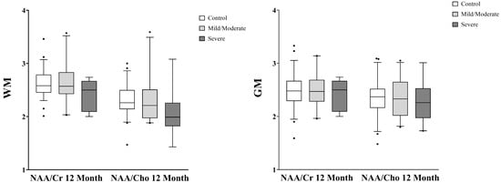 Twelve-month global white matter (WM, left) and gray matter (GM, right) metabolite ratios in control versus complicated mild/moderate and severe TBI subjects. The box represents the 25th percentile, median, and 75th percentile, the whiskers extend from 5% to 95% of data, and the dots represent outliers. There were no differences in global WM or GM NAA/Cr and NAA/Cho ratios between the control and TBI groups. Mean differences were determined by ANCOVA followed by post hoc Bonferroni analysis. ANCOVA, analysis of covariance; cMild, complicated mild; Cr, creatine; Cho, choline, GM, gray matter; NAA, N-acetylaspartate; TBI, traumatic brain injury; WM, white matter.