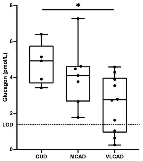 Fasting plasma concentrations of glucagon in patients with carnitine uptake deficiency (CUD, n = 5), medium-chain acyl-CoA dehydrogenase deficiency (MCAD, n = 7), and very long-chain acyl-CoA dehydrogenase deficiency (VLCAD, n = 10). The lower limit of detection (LOD) was 1.5 pmol/L. Each black point represents an individual patient. Note: * = p < 0.05.