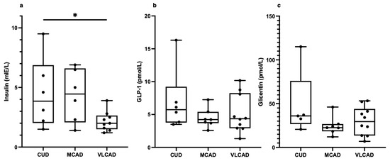 Fasting plasma concentrations of insulin (a), glucagon-like peptide 1 (GLP-1) (b), and glicentin (c) in patients with carnitine uptake deficiency (CUD, n = 6), medium-chain acyl-CoA dehydrogenase deficiency (MCAD, n = 7), and very long-chain acyl-CoA dehydrogenase deficiency (VLCAD, n = 10). For insulin, n = −1 in the MCAD and VLCAD group. For glicentin, n = −1 in the CUD group. Each black point represents an individual patient. Note: * = p < 0.05.