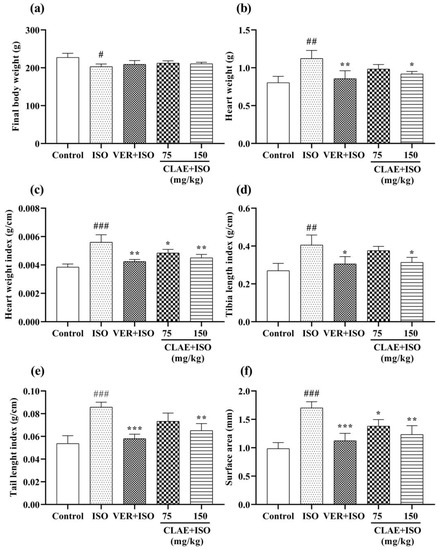 The cardiac hypertrophy was evaluated with the measurement of various biometrical indices such as heart weight, heart weight index (heart weight/body weight ratio), tibia length index (heart weight/tibia length ratio), tail length index (heart weight/tail length ratio) and heart surface area by using a micrometer caliper [45,46].