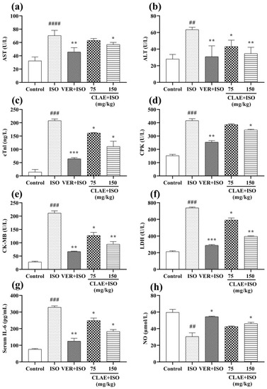 The cardiac biomarkers and lipid profile of blood serum were used to quickly find out the chronic MI in animals. The cardiovascular and inflammatory blood serum biomarkers including alanine transaminase (ALT), aspartate transaminase (AST), creatine phosphokinase (CPK), creatine kinase-MB (CK-MB), lactate dehydrogenase (LDH), troponin I (cTnI), nitrate/nitrite (NO) levels and interleukin-6 (IL-6) and lipid-profile-measuring markers such as high-density lipoprotein (HDL), low-density lipoprotein (LDL), triglycerides (TG) and total cholesterol (TC) levels were estimated by using commercially available enzymatic kits (Creative Diagnostics, Shirley, NY, USA) and quantified at 340 nm by using spectrophotometry as per the instructions of the manufacturer [45,47].
