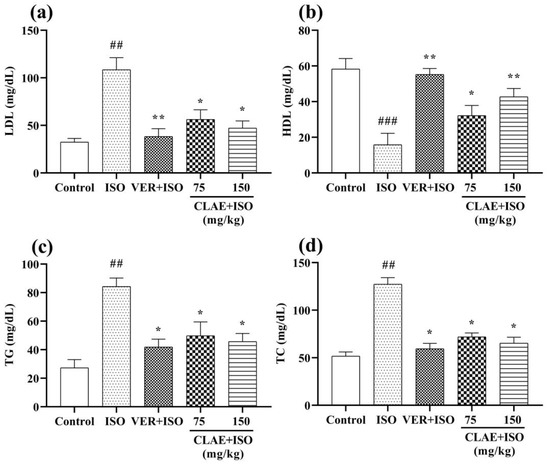 The study for ISO-induced chronic MI was designed for 21 days by following the modified method of Eladwy et al. [43]. A total of thirty male SD rats (weighing 200–250 g) were randomly allotted to five groups (n = 6 in each group) and retained in separate cages. ISO was dissolved in 0.9% normal saline. The control group (Group I) orally received distilled water (10 mL/kg) once daily for 21 days. The intoxicated control group (Group II) received 5 mg/kg/day ISO (subcutaneously) for 10 days (initiated from the 12th experimental day until the 21st day). The reference-drug-administered group (Group III) received verapamil orally at 5 mg/kg/day for 21 days. The extract-treated groups received CLAE orally at a concentration of 75 (Group IV) and 150 (Group V) mg/kg/day for 21 days. For 10 consecutive days (beginning from the 12th experimental day until the 21st day), the subcutaneous injection of ISO (5 mg/kg) was given to the animals of groups III, IV and V after one-hour pretreatment with verapamil and CLAE (75 and 150 mg/kg).