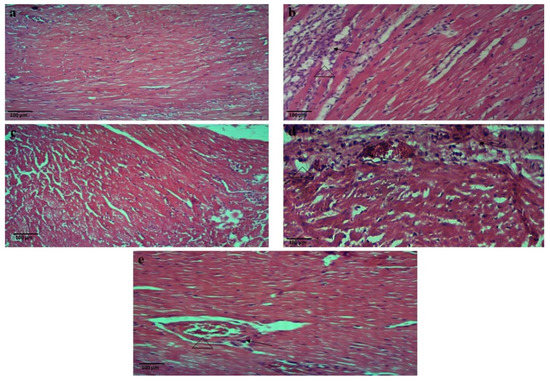 After one day of the last ISO dose administration, the animals were exposed to ketamine (intraperitoneally, 40 mg/kg) and induced anesthesia, and blood samples were collected from the retro-orbital sinus for the determination of biochemical markers in the coagulant and anticoagulant (EDTA) tubes. For the separation of serum and plasma from blood, the centrifugation was performed at 4000 rmp for 10 min at 5 °C and then stored at −8 °C for further analysis. The rats were killed by using the process of cervical dislocation for the removal of heart tissues. For histopathology investigations, the cardiac tissues were fixed in formalin (10%). The fixed heart tissues were dehydrated with 70–100% graded alcohol and embedded into the paraffin blocks at 56 °C. The specimen sections (about 5 µm thick) were cut, placed on the microscopic glass slides, and finally achieved the hematoxylin and eosin (H&E) staining of these tissues. The photomicrographs were taken with the help of a Nikon alphaphot-2 microscope (Nikon, Minato, Japan) attached to the Omax 5 MP digital camera (OMAX, Gyeonggi-do, South Korea), using the ToupView software version 3.7.7817 (ToupTek Photonics, Hangzhou, China). The final body weight of all the animals was measured prior to anesthesia [44,45].