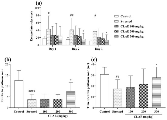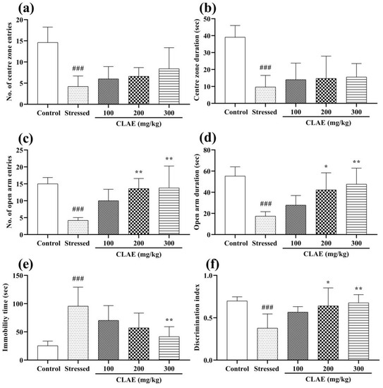 In the EPM test, the apparatus was composed of four arms. Two were closed, and two arms were exposed. These arms formed the plus-shaped maze. The maze had a length and width of 110 cm and 10 cm, respectively. It was positioned 50 cm above the ground. Both the closed and open arms crossed at a central platform (10 × 10 cm center square) that provided access to every arm. Individually, the animals were examined for 5 min in the EPM apparatus by introducing the animal in the middle of the maze while facing an open arm. Time spent on the open arms, as well as the number of entries made into this arm, was measured using the ANY-maze software version 6.1 to explore the anxiolytic potential of CLAE [49].