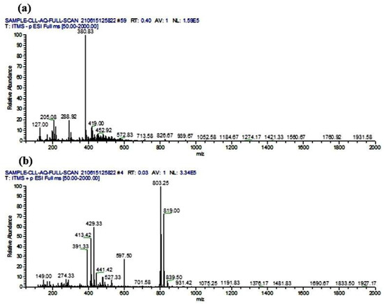 The bioactive constituents in CLAE were identified through LC-ESI-MS/MS analysis. For this purpose, an ion trap linear mass spectrometer equipped with an electrospray ionization (ESI) source was used (LTQ XL model, Thermo Scientific, Waltham, MA, USA). The sample solution was prepared from the ultra-sonication of plant extracts (20 mg/mL) in methanol (LC-MS grade) at 25 °C for 5 min followed by centrifugation at 12,000 rpm for 10 min. Finally, the supernatant was collected and filtered using a nylon syringe filter (0.45 μm). About 50 μL of each sample stock solution was diluted with methanol, and the final volume was adjusted up to 1.0 mL. This solution was directly inserted into the ESI interface using a syringe pump at a 10 μL/min flow rate. The typical operational conditions optimized for negative and positive ionization spectra were established as follows: the capillary voltage, 4000 V; the capillary temperature, 280 °C; the auxiliary gas (N2) flow rate at 6.0 arbitrary units (a.u); the sheath gas (N2) flow rate at 17 a.u; and the scanning mass range set at 50 to 2000 m/z. Depending on the nature of parent molecular ions, the ESI-MS fragmentation was obtained using the collision-induced dissociation energy of 2–15%. The ESI-MS/MS data acquisition was performed utilizing Xcalibur control version 2.0 software (Thermo Scientific, Waltham, MA, USA). The MS spectral data, MS/MS fragmentation pattern and molecular masses of various query mass spectra were compared with reference mass spectra in the published literature, virtual compound libraries and scientific databases including the Human Metabolome Database (HMDB), MassBank and PubChem for the annotation of major phytoconstituents analyzed from CLAE [55,56].