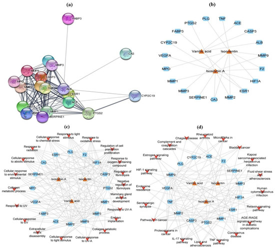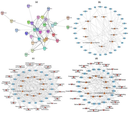 ShinyGo v0.76 was used to extract the GO and KEGG enrichment analysis with Homo sapiens and a 0.05 false discovery rate (FDR) as the cutoff criteria. The analysis and construction of the protein–protein interaction (PPI) network, compound target disease (CTD) network and compound target pathway (CTP) network were achieved in Cytoscape 3.9.1 (National Institute of General Medical Sciences (NIGMS), Bethesda, MD, USA) [68,69,70].