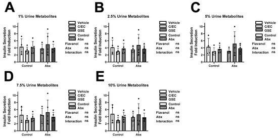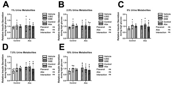 Metabolites Do Not Affect Insulin Secretion during High Glucose Condition. High glucose (12 mM) insulin secretion results of INS-1 832/13 β-cells following 24-h culture with metabolites from rats fed the vehicle (white bars), catechin/epicatechin (C/EC) (light gray bars), or grape seed extract (GSE) (dark gray bars) and treated with (striped bars) or without antibiotics (Abx) (solid bars). Metabolites were diluted in media at 1% (A), 2.5% (B), 5% (C), 7.5% (D), and 10% (E) final concentrations. Values are reported relative to the control β-cells cultured with water (Supplemental Figure S2). Data represent the average of 3 β-cell culture triplicates for each animal (n = 4–5 animals). Represent 2-way ANOVA with Šidák’s post hoc test results of flavanol effects, Abx effects, interaction effects, and significance compared to the vehicle control. Not significant (ns).