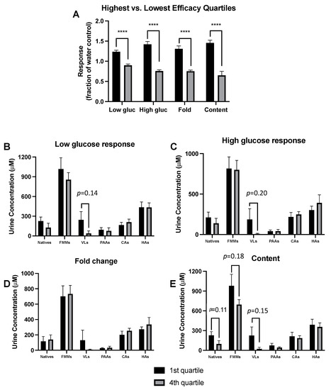 We next performed individual-level analysis of GSIS activity based on metabolite profile, independent of treatment. Due to the large number of treatments, only GSIS data from the 5% urine dose were used. We determined which samples were most vs. least effective modulators of GSIS capacity relative to the vehicle control for the GSIS parameters (irrespective of treatment) and selected the most vs. least effective quartiles (7 animals per quartile) (Figure 5A). This analysis resulted in significant separation, with low variability within quartiles, which facilitates a responder analysis not possible with the constrains of the traditional treatment-based grouping.