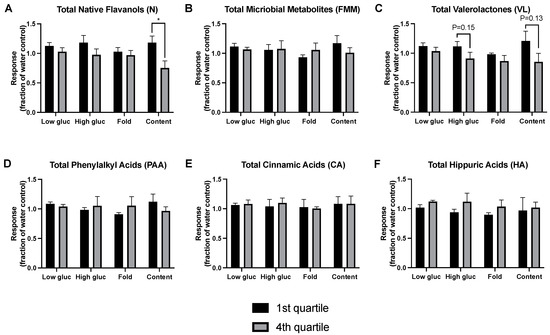 The findings in Figure 5 suggest that specific compound classes are associated with enhanced GSIS activity, when the highest vs. lowest efficacy urine samples were compared independent of treatment. To further evaluate these findings, the reverse analysis was performed: the highest and lowest concentration quartile of each compound class were determined, and the GSIS capacity of these urine derived samples were compared (Figure 6). This reverse analysis strengthened several results from Figure 5. For total native flavanols, the highest quartile of metabolite levels produced significantly higher insulin content levels compared to the lowest levels (Figure 6A). For valerolactones (Figure 6C), the highest vs. lowest quartile approached significance during the high glucose condition (p = 0.15) and insulin content (p = 0.13). There was no significant separation in GSIS response between quartiles for total microbial metabolites or any microbial metabolite class (Figure 6B,D–F). Again, highly conservative tests were used due to the exploratory nature of this analysis and the number of comparisons.