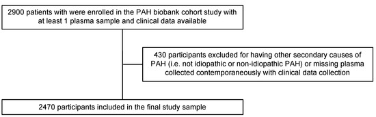 The primary study objective was to compare results from applying different conventional statistical and statistical learning techniques to analyses of high-dimensional metabolomics data in relation to a clinical outcome. We used a cross-sectional study design to identify metabolites associated with clinically important PAH phenotypes, specifically, idiopathic PAH (IPAH) versus other types of PAH (non IPAH). We obtained patient samples from the National Biological Sample and Data Repository for PAH (PAH Biobank), an NIH-funded (R24HL105333, R01HL160941) biorepository of PAH patients enrolled from 37 U.S. centers with deidentified clinical data, stored biological samples, and genetic data. Between 2012 and 2017, the biobank enrolled 2900 PAH patients who had their plasma collected, processed, and stored at baseline. Diagnosis of PAH and PAH subtype were confirmed by right heart catheterization according to established criteria. Patients with other secondary causes of pulmonary hypertension were excluded along with patients without available plasma samples matched to clinical traits, resulting in 2470 patients remaining for the current analyses (Figure 1).