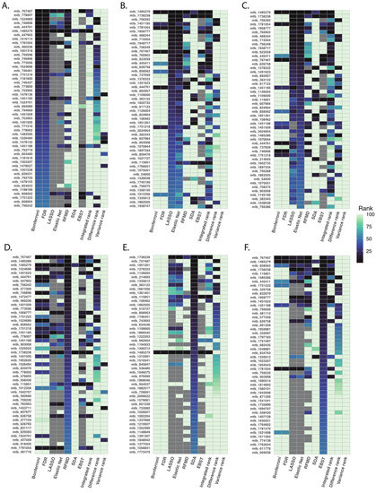 Top 50 ranked metabolites using different statistical methods. After applying six pre-specified statistical methods to our PAH dataset, we ranked metabolites based on lowest to highest p-values for multiple testing correction (Panel (A)), absolute magnitude of coefficients for LASSO and elastic net regression (Panel (B,C)), model accuracy for random forest (Panel (D)), correlation-adjusted t scores for SDA (Panel (E)), and, fractional model contribution for XGBoost (Panel (F)). In general, statistical approaches of similar design produced similar ranking of metabolites.
