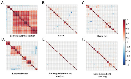 Correlation plots of the top 50 metabolites selected using different statistical methods. For each statistical method applied, we identified the 50 top-ranked metabolites selected by each method and plotted correlation matrices to examine the extent of their intercorrelations. For conventional Bonferroni/FDR methods, the top-ranked 50 metabolites demonstrated a relatively high number of intercorrelations; for other methods, the number of intercorrelations was relatively low.