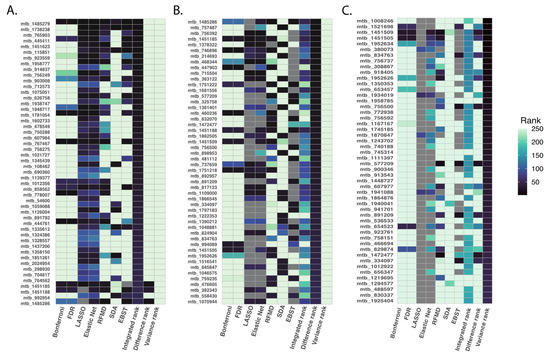 Top 50 ranked metabolites based on summarization rank metrics. To compare the priority ranks generated by all six statistical methods studied, we employed the following metrics: integrated rank was calculated as the summation of rankings from each method, difference rank was calculated as the difference between the maximum and minimum rank for each metabolite and variance rank was calculated as the variance of ranks across different methods. We focused on the top 500 metabolites using the integrated rank. The figure illustrates the top 50 ranked metabolites based on the integrated rank (Panel (A)), difference rank (Panel (B)), and variance rank (Panel (C)).