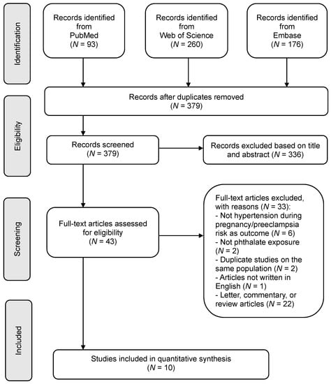 The PRISMA flowchart, illustrating our literature search process, can be found in Figure 1. Our study encompassed a total of 379 studies, incorporating the outcomes of keyword searches. Following an in-depth examination of the full texts, 43 articles were deemed potentially suitable for inclusion in the meta-analysis. Finally, the present study included a total of 10 studies for the meta-analysis. Of the 10 included studies, 6 were performed in North America [9,13,14,23,24,25], 2 were from Europe [15,26], and the remaining 2 were from Asia [16,17]. The studies incorporated in our analysis were published between 2015 and 2021, with participant numbers ranging from 152 to 3273. Among these, nine were cohort studies, while one was a cross-sectional study. Each study assessed phthalate exposure using maternal urinary samples as the measurement method.
