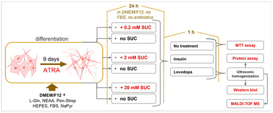 The human neuroblastoma cell line SH-SY5Y, ATCC CRL-2266 (Manassas, VA, USA), was used. The cells were grown in DMEM/F12 high glucose (4.5 g/L) medium (Capricorn Scientific, Ebsdorfergrund, Germany) supplemented with 3 mM L-glutamine, 0.1 mg/mL streptomycin, 100 IU penicillin G (L-Glutamine-Penicillin-Streptomycin solution (Sigma-Aldrich, Saint Louis, MO, USA)), 1x non-essential amino acids (Sigma-Aldrich, Saint Louis, MO, USA), 15 mM HEPES (Sigma-Aldrich, Saint Louis, MO, USA), 10% fetal bovine serum (FBS) (Capricorn Scientific, Ebsdorfergrund, Germany) and 1 mM sodium pyruvate solution (Capricorn Scientific, Ebsdorfergrund, Germany). Cells were differentiated using 10 mM all-trans-retinoic acid (Merck, Kenilworth, NJ, USA) for 9 days (Figure 1). For each experiment, cells were grown and differentiated in at least three biological replicates. Each experimental group had a corresponding control group without treatment with sucralose (SUC) (Esarom, Oberrohrbach, Austria) and insulin (Thermo Fisher Scientific, Waltham, MA, USA) or levodopa (Merck, Darmstadt, Germany). For protein analysis by Western blot and metabolome analysis using matrix-assisted laser desorption/ionization time-of-flight mass spectrometry (MALDI-TOF MS), cells were grown, differentiated and treated in 6-well plates (TPP Techno Plastic Products AG, Trasadingen, Switzerland), and for the MTT viability test, in 96-well plates (Corning Incorporated, Corning, NY, USA).