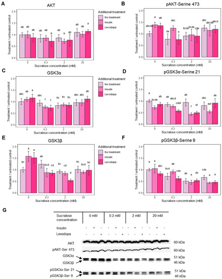 Insulin pathway epitope expression after treatment with sucralose, with and without an additional treatment with insulin or levodopa. Three treatment concentrations of sucralose were used (0.2 mM, 2 mM and 20 mM). A = protein kinase B (AKT), B = protein kinase B phosphorylated at Serine 473 (pAKT-Ser 473), C = glycogen synthase kinase 3 alpha subunit (GSK3α), D = glycogen synthase kinase 3 alpha subunit phosphorylated at serine 9 (pGSK3α-Ser 9), E = glycogen synthase kinase 3 beta subunit (GSK3β), F = glycogen synthase kinase 3 beta subunit phosphorylated at serine 21 pGSK3β-Ser 21, G = representative Western blots of respective epitopes. Epitope levels were calculated from signal intensity and presented as ratio of signal intensity to 0 mM sucralose/No additional treatment group. Two-way ANOVA (AKT), F(6,36) = 0.771, p = 0.5979; Two-way ANOVA (pAKT), F(6,39) = 2.050, p = 0.0819; Two-way ANOVA (GSK3α), F(6,37) = 2.487, p = 0.0402; Two-way ANOVA (pGSK3α-Ser21), F(6,36) = 8.721, p < 0.0001; Two-way ANOVA (GSK3β), F(6,36) = 11.374, p < 0.0001; Two-way ANOVA (pGSK3β-Ser 9), F(6,36) = 4.808, p = 0.0010; post HOC test Tukey HSD with p-value set at p < 0.05. Groups bearing the same letter above the graph are not statistically different.