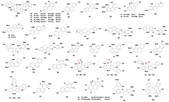 Phenanthrenes are a class of substances with three benzene rings as the parent ring and are commonly found in medicinal orchids. Based on their structural properties, they can be classified into simple phenanthrene, dihydrophenanthrene (DHP), phenanthraquinone (ketone), phenanthrene furan and phenanthrene dimer. Table 1 summarizes the 39 phenanthrenes that were identified from medicinal orchids between 2018 and 2023 (for their chemical structures, refer to Figure 2). Notably, a new DHP trimer was identified from B. striata [12], and silk grass was found to contain six new DHP [13]. Furthermore, monolithic orchids were discovered to have four optically rotating phenanthraquinones [14], and two new phenanthraquinones were found in Dendrobium flowers [15]. Additionally, three secondary metabolites were identified for the first time from plants in the genus Bletilla [12]. These thirty-nine phenanthrenes are listed in Table 1 and include one DHP dimer (28), twenty DHP (29–48), seven simple phenanthrenes (49–55) and nine phenanthraquinones (56–64), as well as furans (65) and biphenanthrene (66).