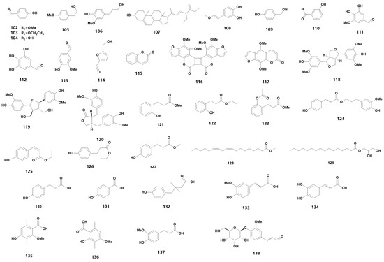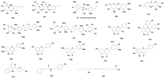 Medicinal orchids encompass a wide range of species, each characterized by a diverse array of secondary metabolites. These metabolites can be further categorized into various material types. For instance, flavonoids can be further sub-classified into flavanones, flavonols and other categories. These flavonoids are widely distributed in medicinal orchid plants and are a primary source of plant pigments. In fact, 66 flavonoids have been detected in 24 orchid plants [23], while 34 different species of Dendrobium have been found to contain flavonoids [24], including D. devonianum [25], D. officinale [26,27,28], D. fimbriatum [29] and D. huoshanense [30]. In the family of Orchidaceae, many types of secondary metabolites still exist, and 54 species are summarized in Table 1 (102–155) (for their chemical structures, refer to Figure 4). Based on their structural characteristics, we have classified them into ethers (102–103), alcohols (104–109), aldehydes (110–114), coumarins (115–117), lignans (118–120), esters (121–129), phenolic acids (130–137), glycosides (138–145) and flavonoids (146–152).