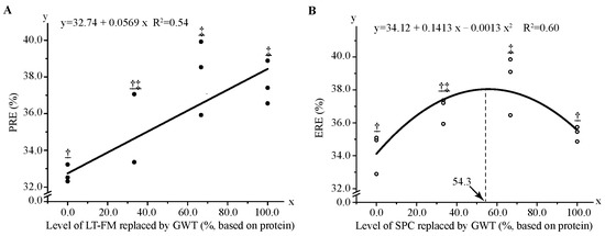 Regression analysis of protein retention efficiency (A) and energy retention efficiency (B) in red spotted grouper fed diet with different GWT inclusion levels. Data were analysed by one-way ANOVA followed by Tukey multiple comparisons, with different underlined symbols indicating significant differences (p < 0.05) among treatments. ERE, energy retention efficiency; GWT, a mixture of wheat gluten, wheat and taurine; LT-FM, low-temperature dried fish meal; PER, protein retention efficiency; SPC, soy protein concentrate.