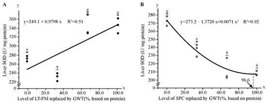 Regression analysis of liver superoxide dismutase (SOD) activity in red spotted grouper fed diet with different GWT inclusion levels. Data were analysed by one-way ANOVA followed by Tukey multiple comparisons, with different underlined symbols indicating significant differences (p < 0.05) among treatments. (A,B) show the regression analysis of replacing LT-FM and SPC with GWT on liver SOD activity, respectively. GWT, a mixture of wheat gluten, wheat and taurine; LT-FM, low-temperature dried fish meal; SPC, soy protein concentrate.