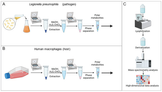 Workflow to quantify metabolism of Lp and THP-1 macrophage-like host cells. (A) Extraction workflow for Lp cultures. (B) Extraction workflow for human macrophages. (C) Quantification of metabolites with a mass spectrometry-based analytical setup, followed by high-dimensional data analysis and graphic output to visualize metabolic alteration. (Created with BioRender.com, accessed on 26 April 2023).