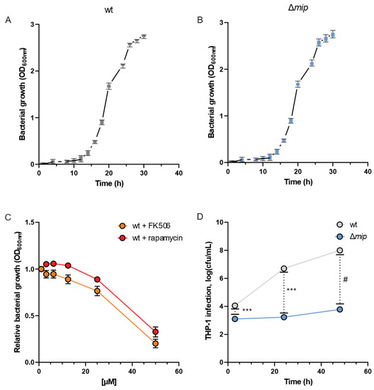 Loss of Mip activity has minor impact on the growth rate but influences infectivity in Lp. Growth curves of Lp (A) wild-type strain and (B) Δmip strain. (C) The Mip inhibitors FK506 and rapamycin reduce growth at concentrations greater than 35 µM. (D) Viable cell numbers after infection of differentiated macrophage-like THP-1 cells are depicted as cfu/mL. Data are presented as mean ± s.e.m or boxes (25th to 75th percentile with median line) and whiskers (min. to max. values) calculated from n = 6 replicates. Changes between wt and Δmip strains were compared using Dunnet’s multiple comparison test with six independent replicates. Statistical significance is indicated by *** p < 0.001, # p < 0.0001.