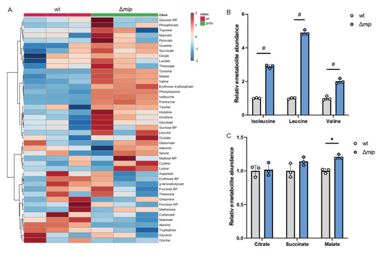 Given that altered Mip activity influences pathogenicity in infection with human macrophages (Figure 2D), we hypothesized that Mip activity may influence metabolism in infections. To better understand how Mip influences Lp metabolism, we applied our metabolic workflow using mass spectrometry approaches (Figure 1). To identify potential metabolic vulnerabilities that may influence Lp virulence, we characterized the metabolism in genetically engineered Lp strains lacking Mip activity [14] and compared it to that of the wild-type strain (wt). We robustly quantified intracellular metabolites and observed changes in amino acid metabolism, as well as metabolites associated with central carbon metabolism, including TCA cycle metabolism (Figure 3A).