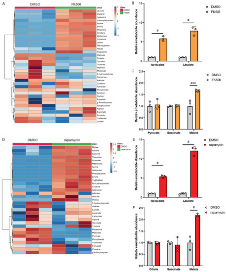 FK506 and rapamycin influence BCAA metabolism in Lp. (A) Heatmap depicting metabolic changes in response to FK506 treatment. (B) Relative metabolite abundance of BCAAs in response to FK506 treatment. (C) Relative metabolite abundance of TCA cycle metabolites in response to FK506 treatment. (D) Heatmap depicting abundances of metabolites in response to rapamycin treatment. (E) Relative metabolite abundance of BCAAs in response to rapamycin treatment. (F) Relative metabolite abundance of TCA cycle metabolites in response to rapamycin treatment. Lp wild-type strains were exposed to 20 µM FK506 or 20 µM rapamycin and compared to DMSO control. All data are presented as mean ± s.e.m. calculated from n = 3 cultural replicates, and each experiment was repeated independently three times. Relative abundances were compared using two-way ANOVA with Šidák’s post-test, and statistical significance is indicated by *** p < 0.001, # p < 0.0001.