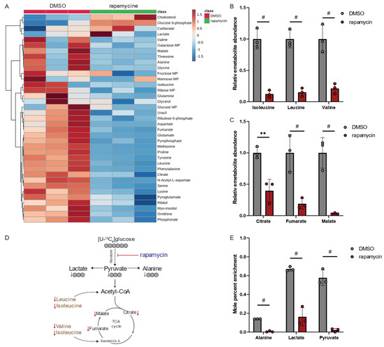 Rapamycin alters BCAA and TCA cycle metabolism in macrophage-like THP-1 cells. (A) Heatmap depicting metabolic changes in response to rapamycin. (B) Relative metabolite abundance of BCAAs in response to rapamycin treatment. (C) Relative metabolite abundance of TCA cycle metabolites in response to rapamycin treatment. (D) Schematic depicting metabolite abundances and carbon distribution on metabolites upon cultivation with [U13-C6]glucose tracer. Red arrows indicate decreased metabolite levels, and gray arrows indicate decreased labeling on metabolites. (E) Mole percent enrichment (MPE) of 13C-carbon atoms from [U13-C6]glucose tracer incorporated into metabolites in response to rapamycin treatment. Cells were treated with 20 µM rapamycin and compared to DMSO controls. All data are presented as mean ± s.e.m. calculated from n = 3 cellular replicates, and each experiment was repeated independently three times. Relative abundances were compared using two-way ANOVA with Šidák’s post-test, and statistical significance is indicated by ** p < 0.01, # p < 0.0001.