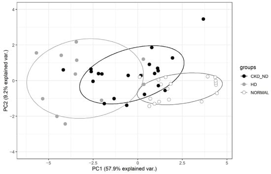 Multivariate analysis. Principal component analysis (PCA) of metabolomic profiles of breath samples from the control (NORMAL), non-dialysis chronic kidney disease (CKD_ND), and hemodialysis (HD) groups using 36 significant volatile organic compounds and 2 significant clinical variables in univariate analysis (as shown in Table 2). PC1 and PC2 indicate the first and second component that explained the largest degree of variation in the dataset of the PCA model, 57.9% and 9.2%, respectively.