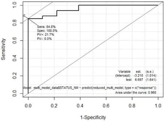 We integrated four significant categorical variables of comorbidities (diabetes, hypertension, dyslipidemia, and CHD) in the second step of multivariate modeling; however, there were no significant independent categorical variables. The final multivariate logistic regression model included three variables: age, 2-methyl-pentane (alkane), and cyclohexanone (ketone). The model was logit(p) = −12.92 + 0.18 × age + 2.10 × 2-methyl-pentane + 2.31 × cyclohexanone, where p is the probability of being a patient with CKD. This model which incorporated age (OR 0.18 (95% CI: 0.07–2.49), p = 0.013), 2-methyl-pentane (alkane) (OR 2.10 (95% CI: 0.94–2.24), p = 0.025), and cyclohexanone (ketone) (OR 2.31 (95% CI: 0.88–2.64), p = 0.008) showed high performance in identifying patients with CKD, with accuracy of 86.3% when applied to all 51 participants (Table 3). Receiver operating characteristic analysis revealed a high area under the curve (AUC) of 0.960 (Figure 4). The mean eGFR of patients in the CKD-ND group was 50.8 ± 26.9 mL/min/1.73 m2, which included many patients with CKD in the early stage, but the final model discriminated patients with CKD from normal controls with high accuracy. Figure 5 shows the significant changes in cyclohexanone and 2-methyl-pentane levels in the normal, CKD-ND, and HD groups (before and after hemodialysis).