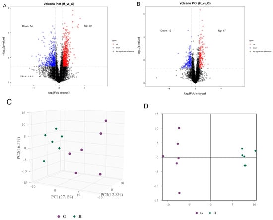 The different metabolite analysis between groups. (A) Volcanic plot of metabolites in the positive ion modes. (B) Volcanic plot of metabolites in the negative ion modes. Red circle, upregulated significantly differential metabolites; blue circle, down-regulated significantly differential metabolites. (C) PCA scores of group H and G. (D) OPLS-DA scores of group H and G.