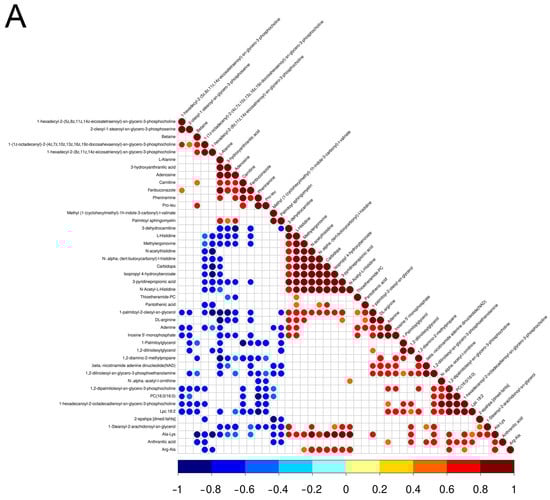 Heat maps of correlation between differential metabolites in the positive (A) and negative (B) ion modes. Red, positive correlation; blue, negative correlation.