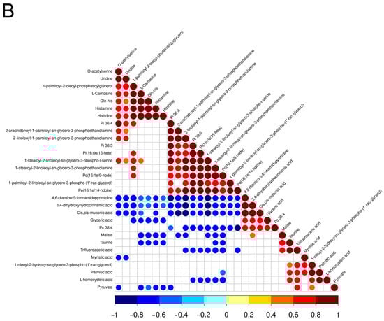 The market value of aged chickens is low due to their poor sensory traits, especially aged laying hens []. However, people from some areas prefer aged hens for stews because they believe the aged chickens have higher nutritional value and flavor, which results in a high market value of aged hens. Previous studies confirmed that there are differences in meat quality between aged laying hens and broilers, for instance, water holding capacity, tenderness, and cooking loss []. In addition, there were differences in nutritional value and flavor between laying hens and broilers [,]. To further reveal the metabolic reasons for the differences in meat quality between aged laying hens and broilers, UHPLC-MS/MS was employed to determine the metabolites of the pectoral muscle of aged laying hens and broilers. A total of 74 differential metabolites were identified in the positive and negative ion model (Table 3), including 27 metabolites higher in group G and 47 metabolites higher in group H (Figure 1A,B). The results of PCA and OPLS-DA also indicated that a significant difference was found in the metabolism of pectoral muscle between group H and group G (Figure 1C,D). The result of Pearson correlation analysis showed that 44 metabolites were correlated in the positive ion modes and 30 metabolites were correlated in the negative ion modes (Figure 2A,B).
