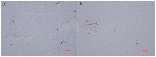 Oil red O staining of pectoral muscle sections of Guangyuan grey chicken (A) and Hy-Line grey hen (B). The sample was observed with an optical microscope (100×). Red arrows point to lipid droplets.