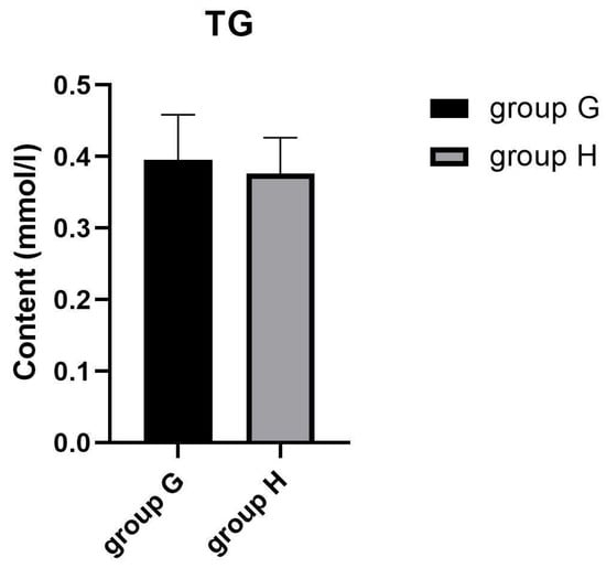Many metabolites involved in lipid metabolism were identified in groups G and H which may be involved in the regulation of intramuscular fat deposition. The contents of intramuscular fats are important indexes to evaluate meat quality, since they were confirmed to affect the flavor and tenderness qualities of chicken meat []. In this study, oil red O staining was employed to observe the distribution of lipid droplets in muscle cells. As shown in Figure 3A,B, the lipid droplets are mainly distributed in cell membranes and intercellular space in groups G and H. Compared with group G, more intracellular lipid droplets were in the pectoral muscles of group H. These results indicate that the lipid deposition of pectoral muscles between laying hens and broilers may be different, which may be to adapt to the different production modes of laying hens and broilers. TG in skeletal muscle was confirmed to be decisive for IMF deposition []. Herein, we determined the content of triglyceride (TG) in the pectoral muscles of group G and H. The result showed that there was no significant difference of TG content between group G and H (Figure 4). These results suggested that older laying hens may exhibit similar flavor and tenderness compared with female broilers under the same feeding conditions.