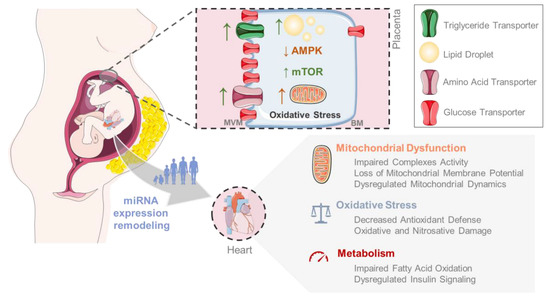Figure 1. Maternal obesity (MO) can program the offspring to develop cardiovascular disease (CVD) through various mechanisms. MO induces placental dysfunction characterized by increased expression of triglycerides and amino acid transporters, enhanced lipid droplets, decreased AMP-activated protein kinase (AMPK) activation, decreased mTOR gene expression, and the presence of oxidative stress. Moreover, MO contributes to offspring’s cardiac epigenetic and metabolic remodeling, resulting in impaired fatty-acid oxidation, dysregulated insulin signaling, mitochondrial dysfunction, and elevated oxidative stress.