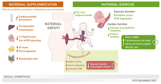 To counteract the adverse effects of MO on the offspring’s cardiometabolic health, several studies suggested positive impacts of maternal lifestyle interventions on the offspring’s cardiometabolic function and gut microbiota, including physical activity, nutritional adaptations, and supplementation [171,172]. Exercise before and during gestation in combination with an adequate and balanced diet resulted in lower male offspring’s blood glucose concentration, insulin levels, and plasma triglyceride levels, and alterations in gut microbiota diversity, such as enriched operational taxonomic units (OTUs) affiliated with Bacteroides and Blautia [201]. The UK Pregnancies Better Eating and Activity Trial (UPBEAT), consisting of an 8-week intensive lifestyle intervention in human offspring’s diet and physical activity, prevented the concentric cardiac remodeling observed in 3-year-old offspring of obese women subjected to standard antenatal care, including the increased interventricular septum, posterior wall, and relative wall thickness [202].