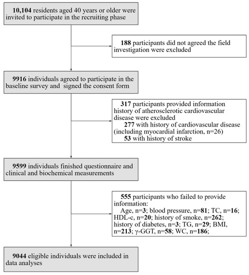 The study was a cross-sectional study performed in communities in Guangzhou, China in 2011 with a participation rate of 98.1% (9916 out of 10,104 eligible individuals signed the consent form). The study was initiated in early 2011, and the collection of baseline screening data was completed by mid-2012. It was based on the Risk Evaluation of cAncers in Chinese diabeTic Individuals: a lONgitudinal (REACTION) study and data have been published previously [13,14,15,16,17]. The study population excluded individuals with type 1 diabetes. A subset of participants (n = 317) provided information history of atherosclerotic cardiovascular disease and were excluded from the analysis. This group comprised participants (n = 277) with a history of cardiovascular disease, which encompassed cases of myocardial infarction (n = 26), and those with a history of stroke (n = 53). A total of a total of 555 individuals who failed to provide information (age, n = 3; blood pressure (BP), n = 81; total cholesterol (TC), n = 16; high-density lipoprotein cholesterol (HDL-C), n = 20; history of smoking, n = 262; history of diabetes, n = 3; TGs, n = 29; BMI, n = 213; γ-GGT, n = 58; and WC, n = 186) were also excluded as they had missing data points. The details of the selection of study participants are presented in Figure 1.
