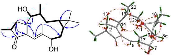 Compound 1 was isolated as colorless massive crystals (methanol). Its molecular formula was defined as C20H30O3 by its positive HRESIMS spectrum, which showed a sodium adduct ion peak at m/z 341.2083 [M + Na]+, giving the molecular formula C20H30O3Na calculated as 341.2093, and six degrees of unsaturation. The IR spectrum showed absorption bands at 3434, 1682, and 1631 cm−1, which indicate the presence of hydroxyl and carbonyl functionalities. The 1H NMR spectrum of compound 1 showed two double-peaked methyl signals at δH 0.99 (3H, d, J = 7.0 Hz) and 1.23 (3H, d, J = 7.0 Hz), a broad double-peaked methyl signal at δH 1.53 (3H, br d), two single-peaked methyl signals at δH 0.81 (3H, s) and 1.08 (3H, s), two oxymethine protons at δH 4.40 (1H, d, J = 5.5 Hz) and 4.94 (1H, t, J = 5.0 Hz), an exchangeable proton at δH 1.61 (1H, d, J = 5.0 Hz), and a tridisubstituted double bond at δH 6.05 (1H, s). The 13C NMR data (Table 1) showed 20 carbons, including five methyls [δC 14.9, 15.7, 16.4, 17.8, and 29.1], three methylenes [δC 26.4, 29.0 and 35.5], seven methines (including one sp2 hybrid methine at δC 114.6, two oxygen-linked methines at δC 70.9 and 73.1, and four others at δC 20.0, 22.6, 37.1, and 39.9), and five quaternary carbons (including three sp2 hybrid quaternary carbons at δC 136.7, 145.3, and 177.4, one carbonyl group at δC 210.1, and one sp3 hybrid quaternary carbon at δC 16.2), which suggests a typical lathyrane-type diterpene with a 5/11/3-membered ring system [16].