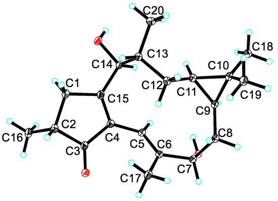The relative conformation of compound 1 was determined by the ROESY experiments, which showed the following correlation signals (Figure 2): H-14 (δH 4.94)/H-11 (δH 0.49), H-11/H-9 (δH 0.93), H-11/H3-20 (δH 0.99), H-14/H-5 (δH 6.05), H-11/H3-18 (δH 1.08), and H-9 (δH 0.93)/H3-18. These data suggested that H-14, H3-20, H-9, H-11, and H3-18 are cofacial and assigned as α-oriented and determined the β-configurations of H-13 and OH-14 simultaneously. The ROESY cross-peaks of H-13 (δH 1.98)/H-1β (δH 2.91) and H-1β/H-2 (δH 2.46) determined H-2 as a β-configuration and H3-16 as an α-configuration. However, the H-7 (δH 4.40)/H3-17 (δH 1.53) cross-peaks were insufficient to determine their conformations. Fortunately, the crystals of compound 1 were obtained, which confirmed the correctness of the relative conformation determined by the ROESY spectrum described above and assigned H-7 as a β-configuration and OH-7 as an α-configuration. Interestingly, although the planar structures of compound 1, kansuingols A and B, are quite similar, there are many differences in their relative conformations, that is, methyl-16, methyl-20, and hydroxyl-7 of compound 1 are α-oriented, while the corresponding groups of kansuingols A and B are β-oriented [17]. Finally, the Flack parameter value of the crystal structure of compound 1 was 0.03(9), which led to the determination of its absolute configuration, as shown in Figure 3.