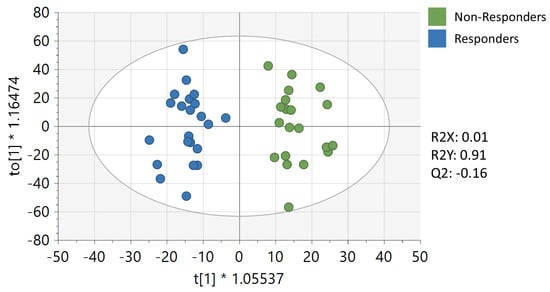 After preprocessing, 9647 peaks remained in the untargeted metabolomics dataset. Supervised OPLS-DA analysis of baseline metabolomics data for responders to weight loss in the clinical trial versus those who were non-responders showed significant separation between the two groups with a high goodness-of-fit value for the model (R2Y = 0.905), although it had a low predictive ability (Q2 = −0.16) (Figure 1), presumably due to the low sample size. Notably, the unsupervised PCA analysis (Supplementary Figure S1) did not reveal a good visual separation between responders and non-responders. However, the supervised analysis was used to determine the signals/metabolites that contribute to the separation of responders and non-responders in the OPLS-DA model, allowing for observable metabolic differences between the two groups. The variable importance to projection (VIP) score provides an estimate of the importance of each of the signals/metabolites to the differentiation of the responders and non-responders in the OPLS-DA model. A VIP ≥ 1 indicates that the signal/metabolite is important to the differentiation of the responders and non-responders (Supplementary Table S1). No significant differences were observed in any clinical baseline characteristics between responders and non-responders (Table 1), indicating that metabolic differences were attributable to responder status in this analysis.
