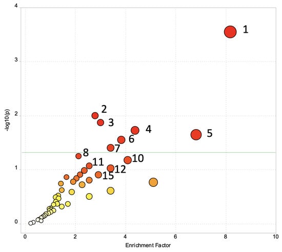 Pathway enrichment analysis of baseline serum samples comparing responders versus non-responders. Statistical significance is at approximately 1.3 on the −log10 scale (denoted by a green line). Pathway names corresponding to annotated numbers can be found in Table 2.