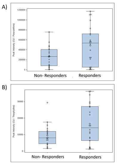 Distribution of (A) paraxanthine and (B) theophylline in responders and non-responders. Individual study participants are indicated by circles, the mean is indicated by the diamond within each box, and the median is represented by a horizontal line within each box. The bottom of the box represents the 25th percentile and the top of the box represents the 75th percentile.