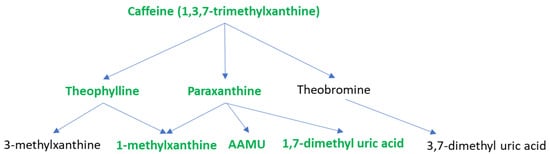 Caffeine and caffeine metabolites differed in baseline samples between responders and non-responders. AAMU, 5-Acetylamino-6-amino-3-methyluracil. The metabolomics method did not differentiate between the structural isomers depicted. Metabolites in green were significantly increased in responders.