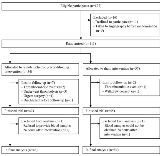 In total, 100 patients were included in final analysis: 46 patients from the RIPC group and 54 patients from the sham group (Figure 1).