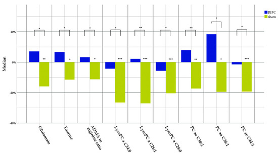 Changes in metabolite levels 24 h post-intervention in the RIPC and sham groups. Changes in metabolite concentrations were calculated by subtracting the baseline measurement values from the 24 h measurement values, and are represented as percentages from baseline measurement. All statistical analyses reflecting changes between the groups were conducted using the Mann–Whitney U test. Only the results that are statistically significant, following the application of the Benja-mini–Hochberg method for multiple comparison correction, are provided. ADMA—asymmetric dimethyl arginine; LysoPC—lysophosphatidylcholine; PC—phosphatidylcholine; a—acyl; aa—diacyl; ae—acyl-alkyl. * p < 0.05; ** p ≤ 0.01; *** p ≤ 0.001. Detailed original concentration values and p-values are provided in Table S3 of the Supplementary Materials.
